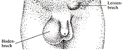 Der Leistenbruch tritt oberhalb des Leistenbandes aus, er kann beim Mann bis tief in den Hodensack reichen (sogenannter Hodenbruch).